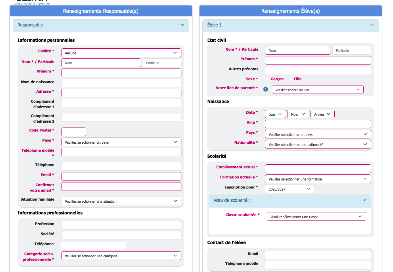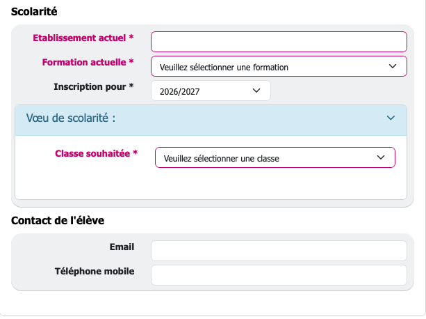 Sélectionnez votre situation actuelle (diplôme, établissement, année, statut, formation visée et langue) puis précisez vos souhaits de parcours.